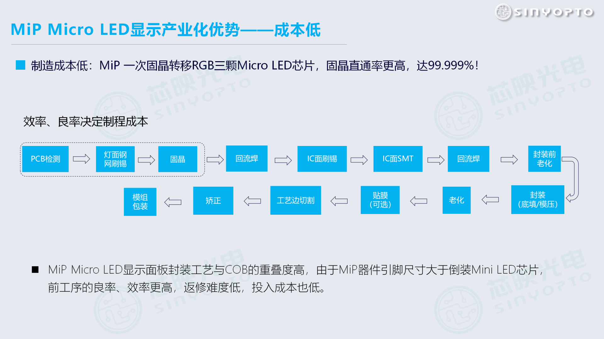 MiP一次固晶直通率高达99.999%,有效降低了制造成本。此外,Micro LED芯片尺寸更小,使得MiP器件成本具有更大的下降空间,为大规模产业化提供了有力支持。