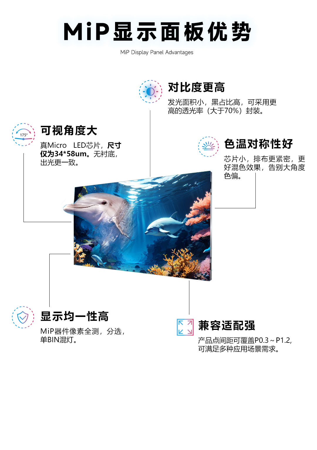 该屏幕基于量产的真MiP0202器件打造,芯片尺寸仅为 34×58μm,通过无衬底设计与巨量转移工艺实现超高像素密度与精准色彩控制。结合黑底填充技术,使黑占比达到99%以上,HDR效果与对比度大幅超越传统Mini LED,并以178°广视角、零色偏显示,为展会现场带来沉浸式无死角的视觉体验。