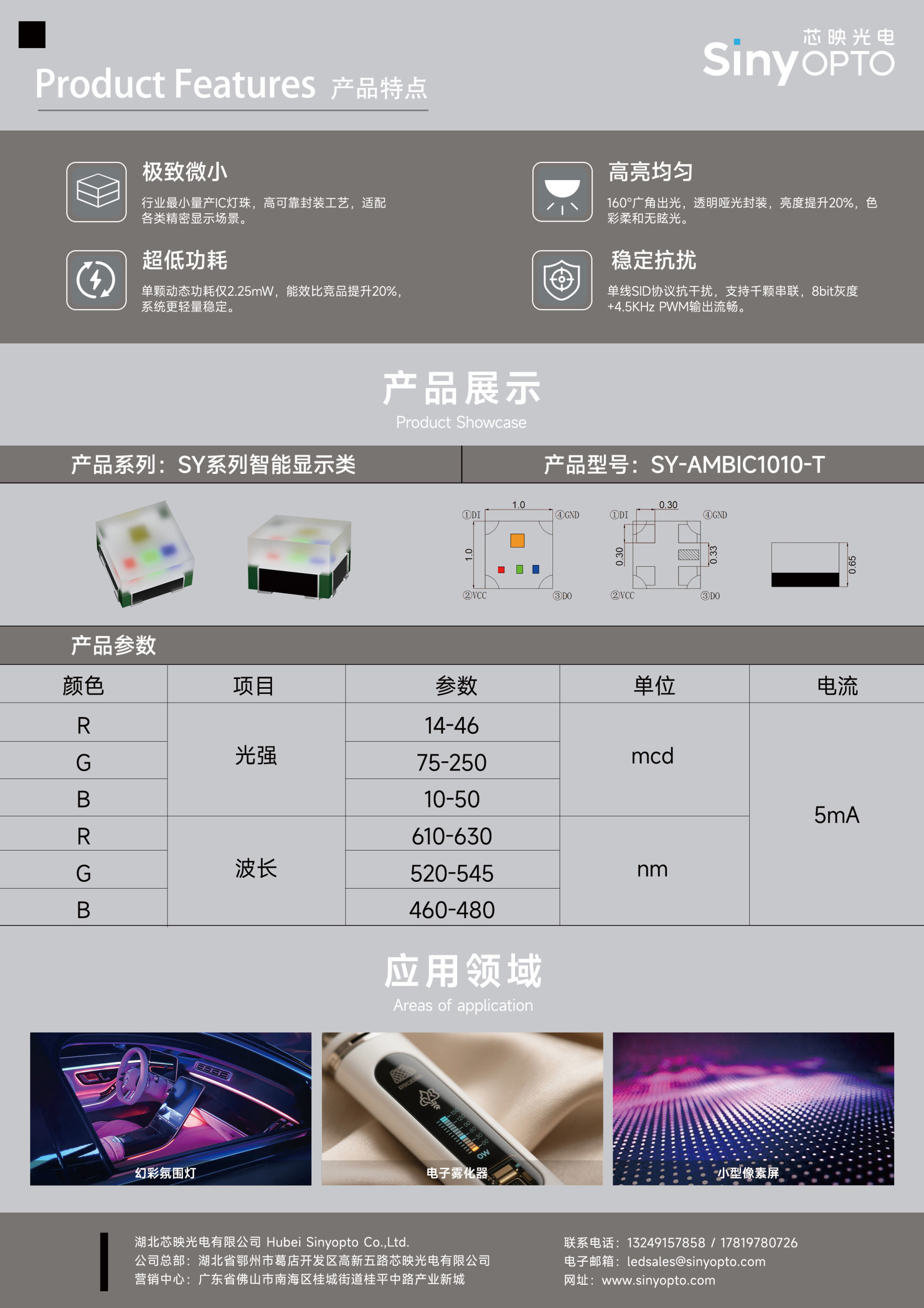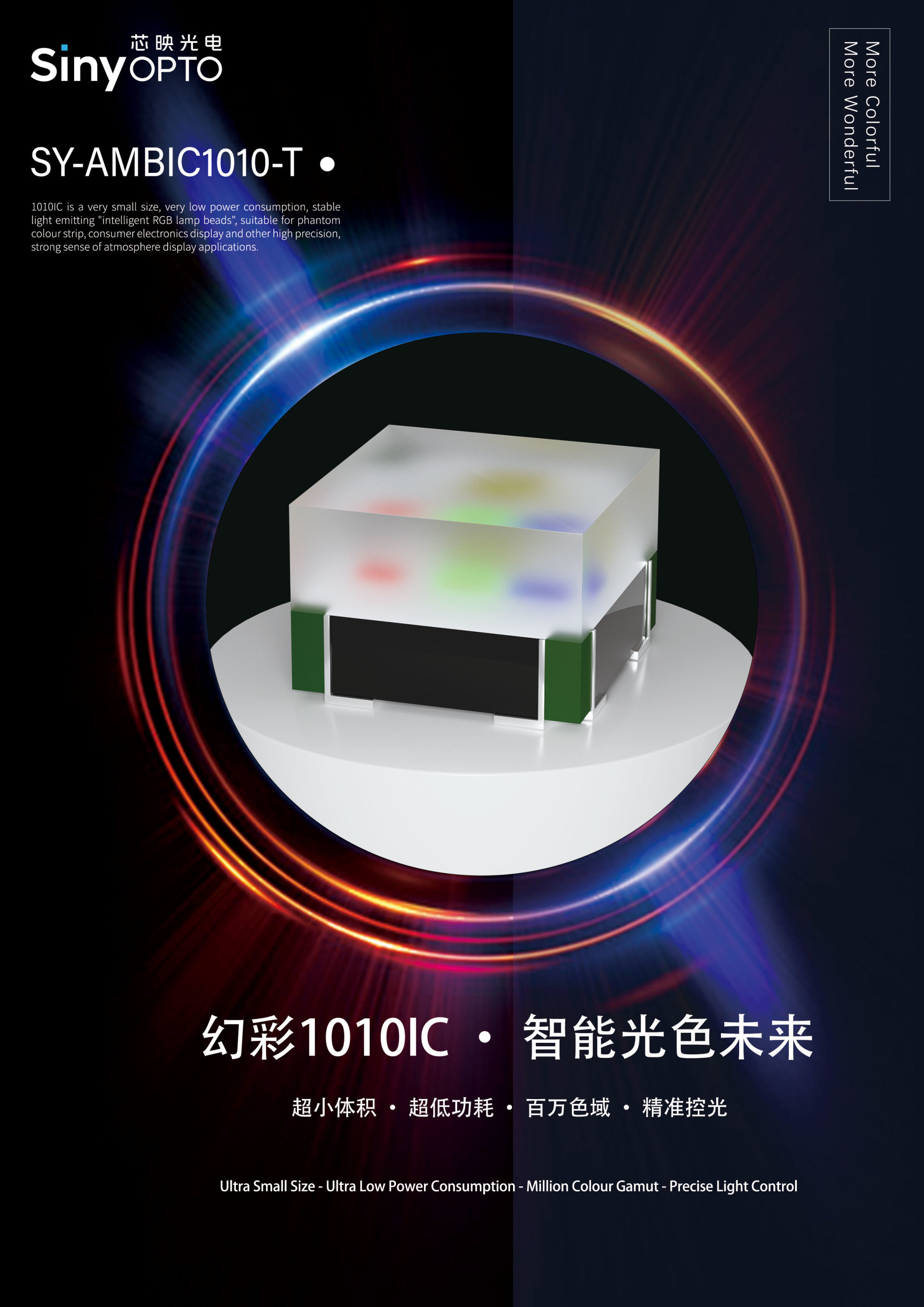 芯映光电全新推出的内置IC幻彩灯珠——SY-AMBIC1010-T,在尺寸、性能、能效与稳定性等方面实现多重突破,适用于幻彩灯带、车载氛围灯、家电光效模块、智能穿戴等多类应用场景,为客户提供更高集成度的幻彩解决方案。